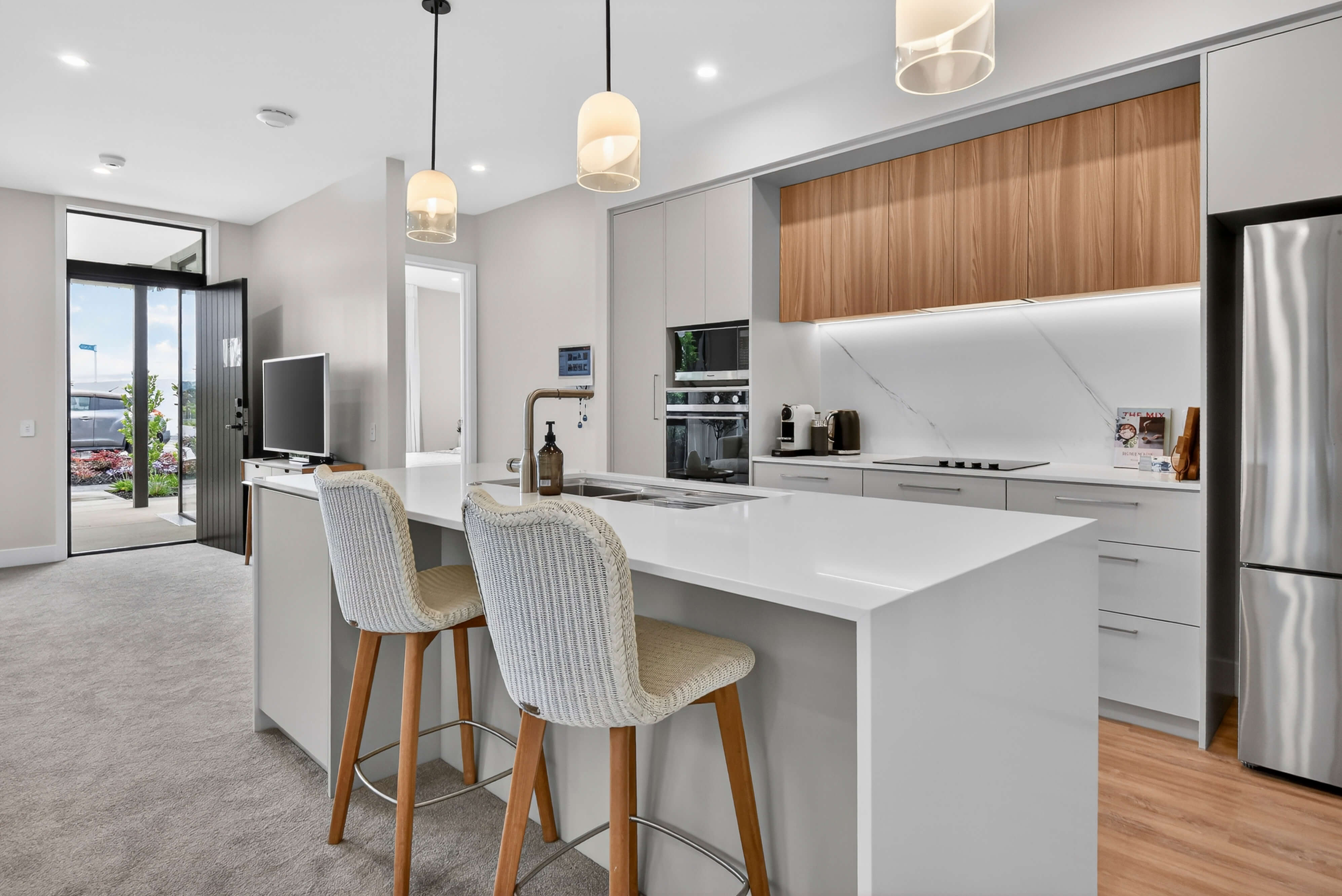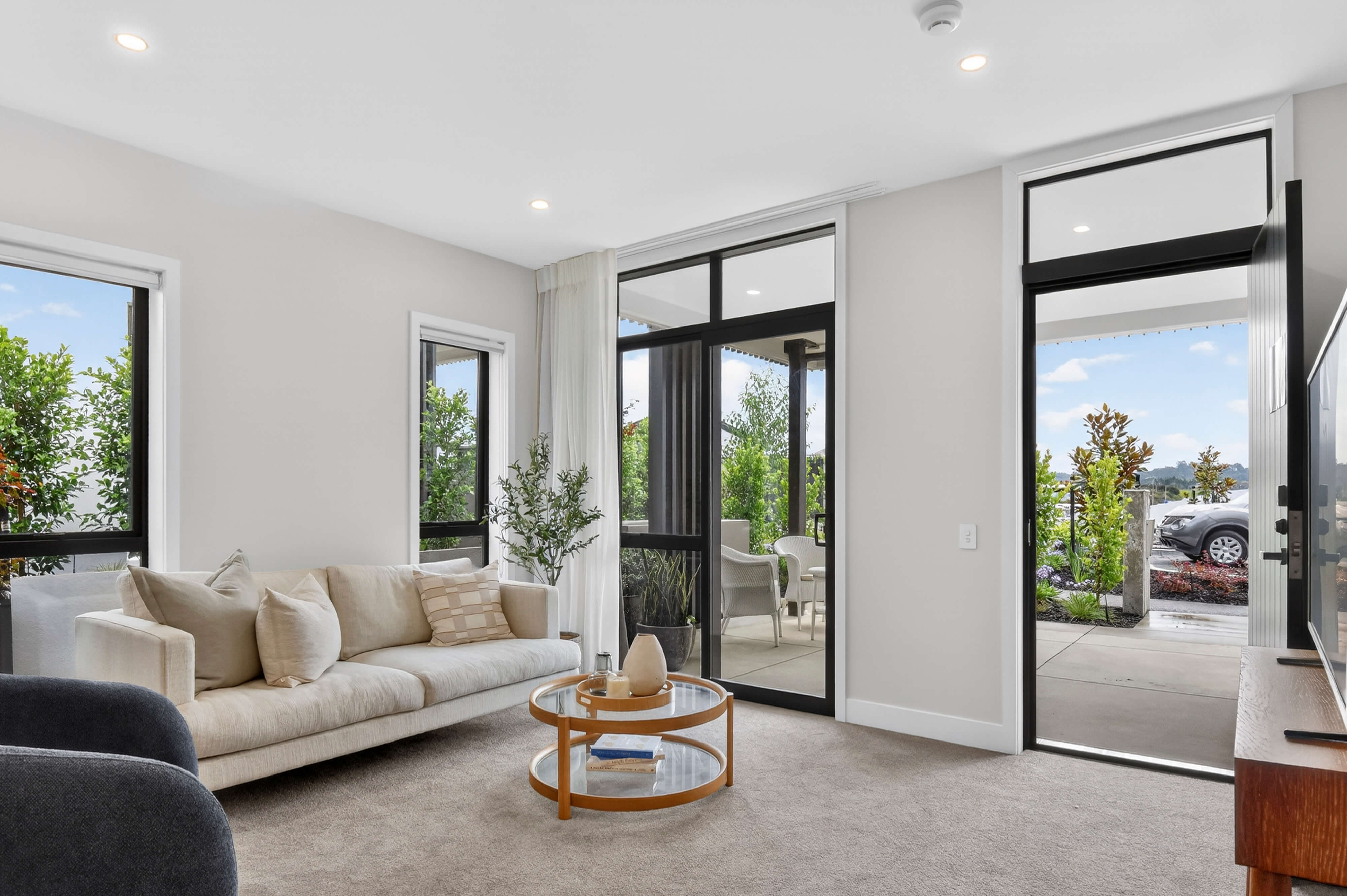 The generous designer kitchen flows into the open plan living area, and the ceilings are raked to ensure this home is flooded with light. Views across the village with its manicured gardens and lush green walkways, out to the rolling green countryside of Dairy Flat complete the picture. This is a must-see if you are looking for spacious, light-filled, elegant living with impressive, elevated views.