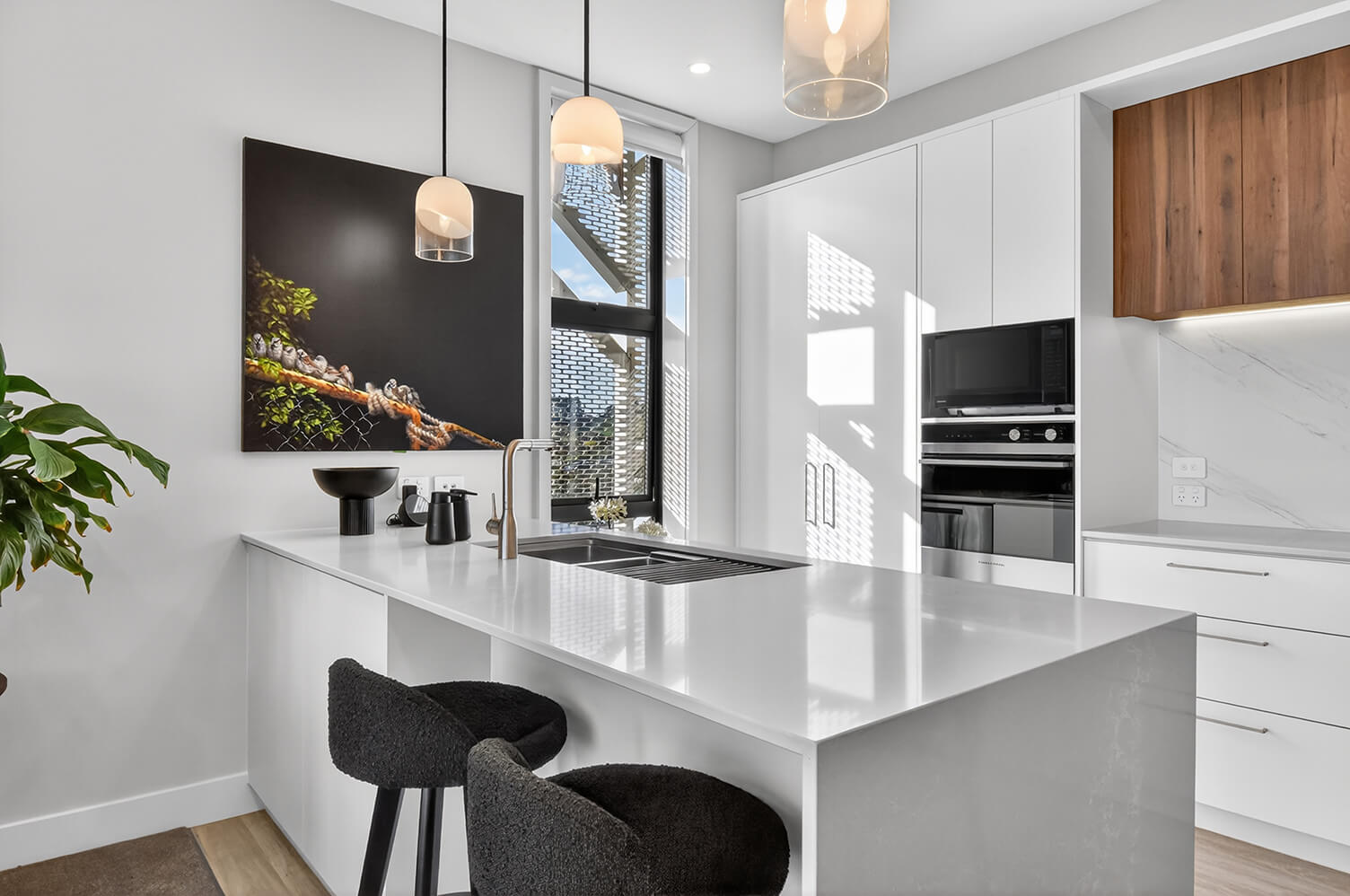 The floor to ceiling glass fills the penthouse apartment with light and offers majestic views across Silverdale. The designer kitchen and open plan living area flow through to stacked sliding doors, providing easy access to a large sunny balcony.