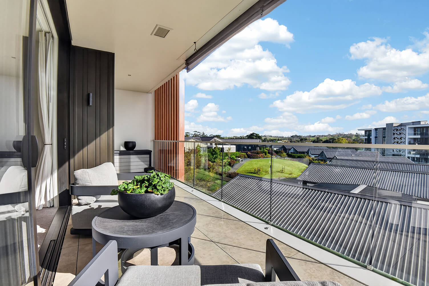 Elevated on the first floor, the generous wrap-around balcony is a standout feature, offering multiple vantage points to enjoy views across The Botanic’s Summer Lawn and landscaped gardens, stretching out to the green countryside and rolling hills of Dairy Flat beyond. It’s the perfect spot for a morning coffee or evening alfresco dining.